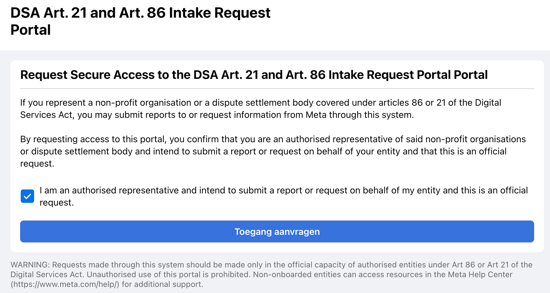 Wie doorklikt komt op een weinig uitnodigende pagina uit – Meta begint hier te schermen met de DSA, Digital Services Act – met daarop een formulier waar je een e-mailadres kunt ingeven. Dat zou je gedurende een uur toegang moeten geven tot een niet nader omschreven “tool”, maar de redactie kreeg met een privé-email adres als respons: “email address provided is not an onboarded partner email address. Please try again with a valid email address”. Conclusie: Meta is er niet voor jou, jij bent er voor Meta.