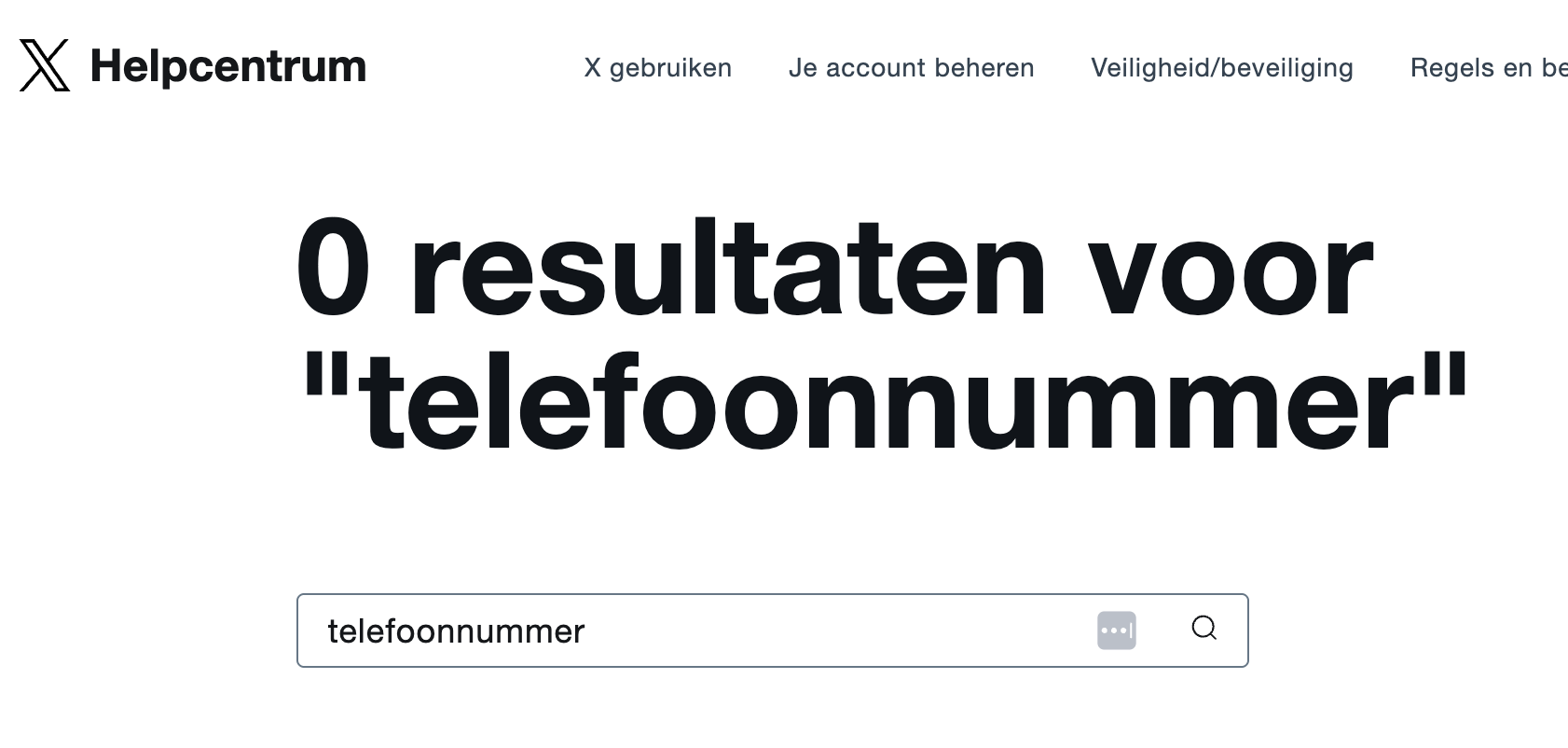 Tot slot X ofwel het voormalige Twitter. Op de helppagina staat een duidelijke button: neem contact met ons op. Op de betreffende pagina staan echter alleen selfservice-opties; wanneer je ‘telefoonnummer’ intikt bij het zoekscherm krijg je een duidelijke respons: ‘nul resultaten’. Dat zegt genoeg.