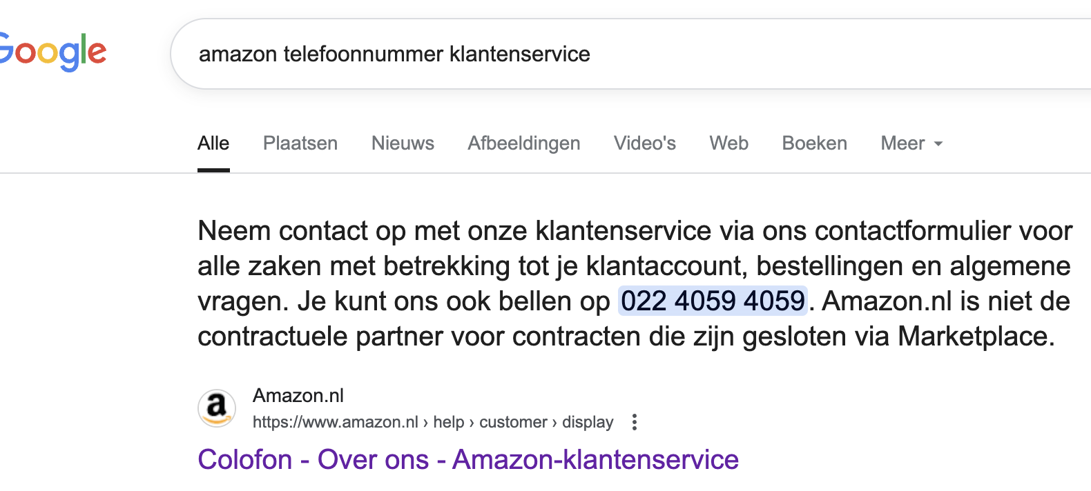 In het geval van Amazon krijg je na de zoekopdracht in Google een snippet te zien van de webpagina van de klantenservice van Amazon, waar ook meteen het telefoonnummer (022 4059 4059) in staat. Doorklikken levert een pagina op met daar onder meer de mededeling “Neem contact op met onze klantenservice via ons contactformulier voor alle zaken met betrekking tot je klantaccount, bestellingen en algemene vragen. Je kunt ons ook bellen op 022 4059 4059.” Wie dat contactformulier wil gebruiken, moet eerst inloggen. Het telefoonnummer is echter niet in gebruik.