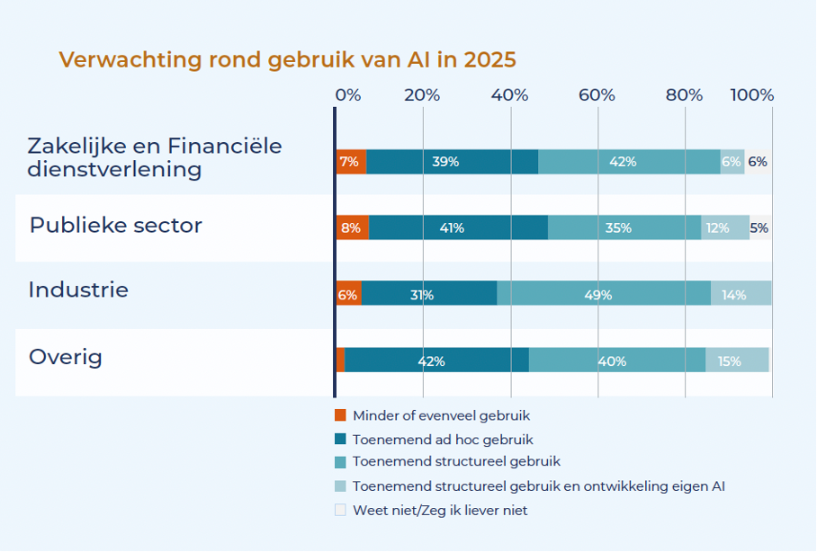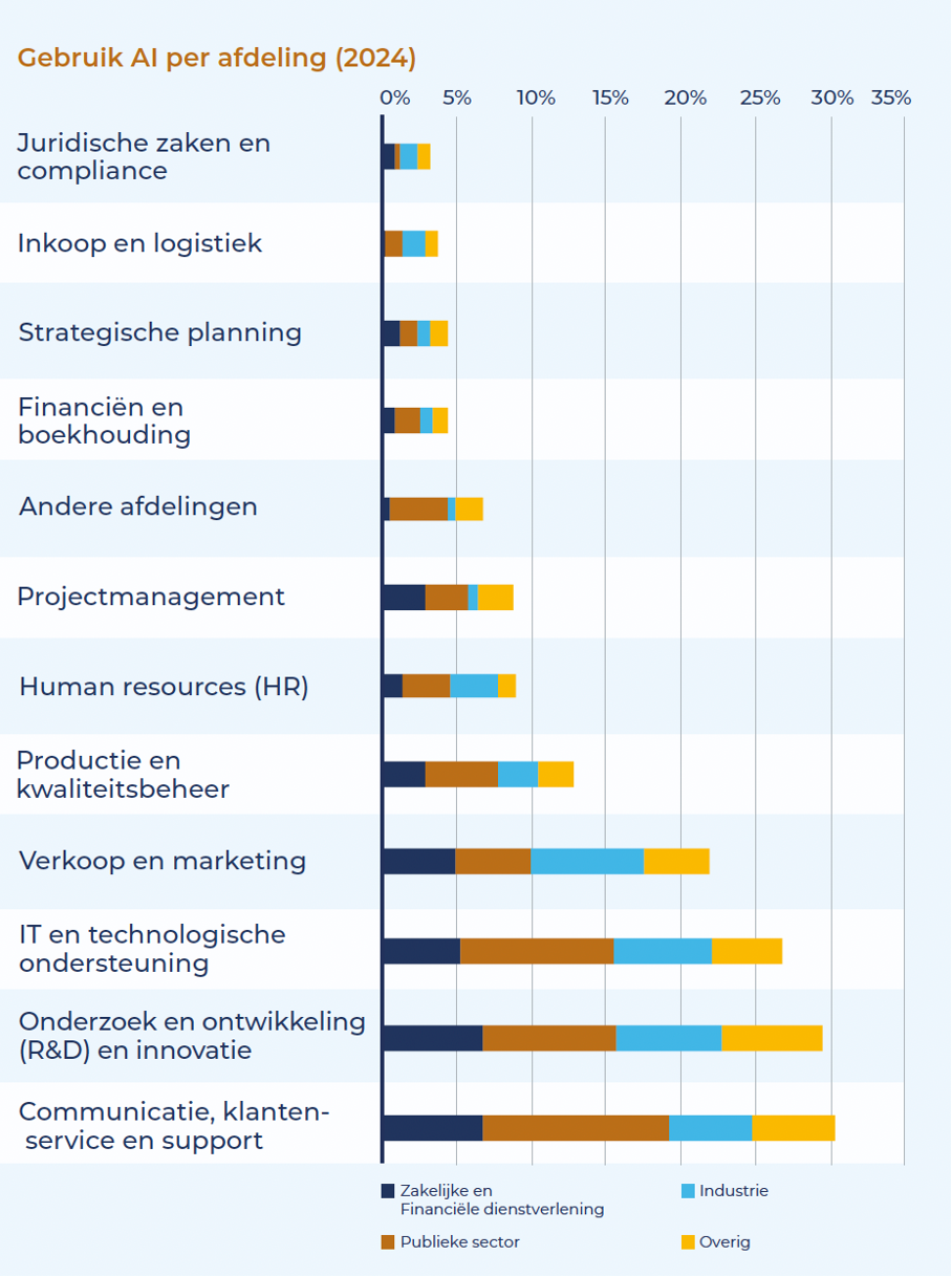 De afdelingen communicatie, klantenservice en support zijn binnen Nederlandse organisaties de koplopers in het gebruik van AI. Toepassing in afdelingen of processen zoals strategische planning, financiën en juridische zaken is nog zeldzaam. Meer dan 90% van de respondenten verwacht echter dat AI-gebruik de komende jaren toeneemt, vooral op de afdelingen waar nu al ervaring is opgedaan.