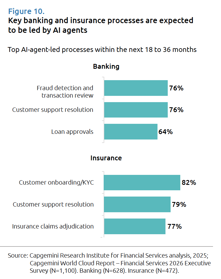 Andere belangrijke processen die in aanmerking komen voor de toepassing van AI zijn acceptatie (68%), schadeafhandeling (65%) en onboarding (59%). Specifiek voor banken zijn de belangrijkste processen voor grootschalige implementatie van AI-agents klantenservice (75%), kaarten en betalingen (64%), fraudedetectie (64%), kredietverwerking (61%) en klantonboarding (59%).