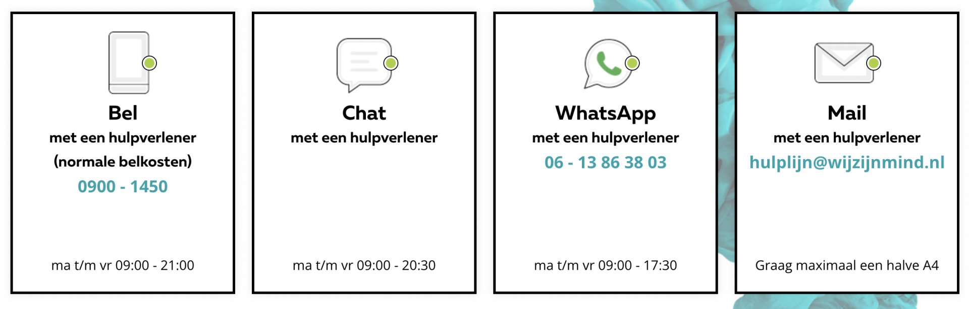 De hulplijn is bereikbaar via telefoon, chat, WhatsApp en e-mail, en wordt bemand door gekwalificeerde hulpverleners. (Pegamento)
