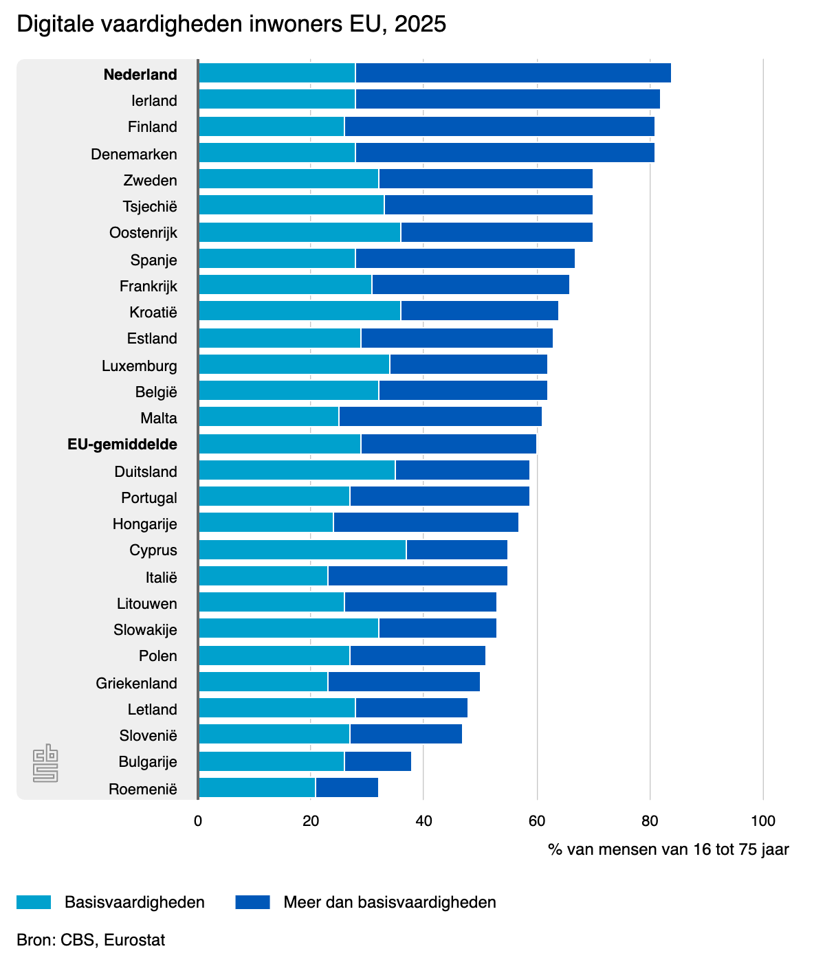 Nederland had binnen de EU in 2025 het hoogste percentage inwoners met ten minste digitale basisvaardigheden: 84 procent. Hiermee heeft Nederland het EU-doel van ‘digitalisering 2030’ al bereikt.