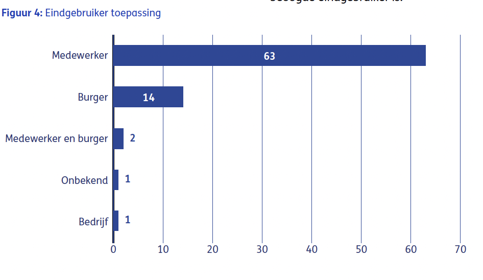 Bijna de helft van de toepassingen wordt door gemeenten ingezet. Het betreft voornamelijk chatbots die assisteren in het vergaren en verwerken van informatie voor ambtenaren en die assisteren in het contact met de burger.
