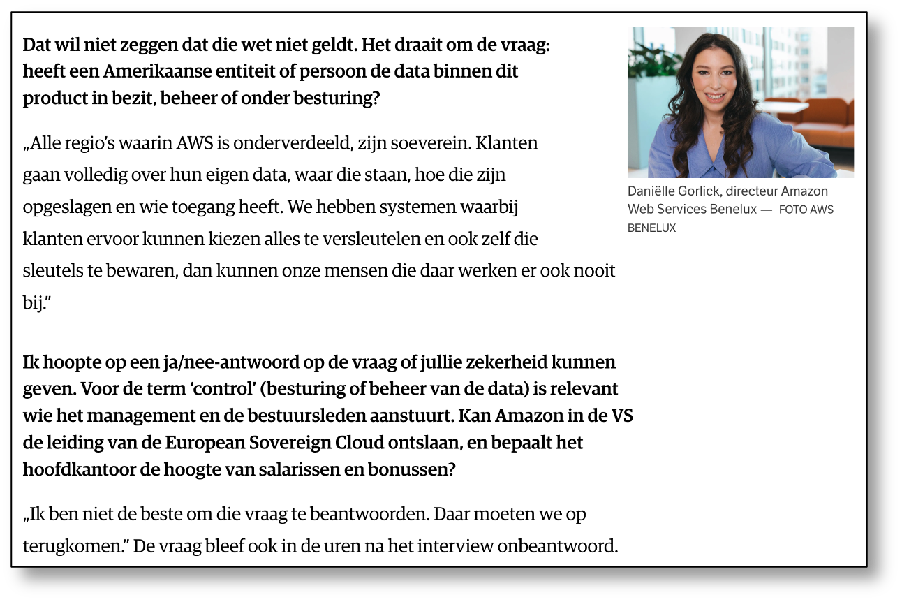 De European Sovereign Cloud van AWS wordt gepresenteerd als een cloudomgeving die volgens AWS volledig in Europa ontwikkeld, beheerd, gecontroleerd en beveiligd wordt en die onafhankelijk is van de wereldwijde AWS-cloud. NRC wist in een interview begin dit jaar al boven tafel te krijgen dat AWS als het er echt op aankomt, geen garanties kan geven over invloed vanuit de VS op het Europese bedrijf.